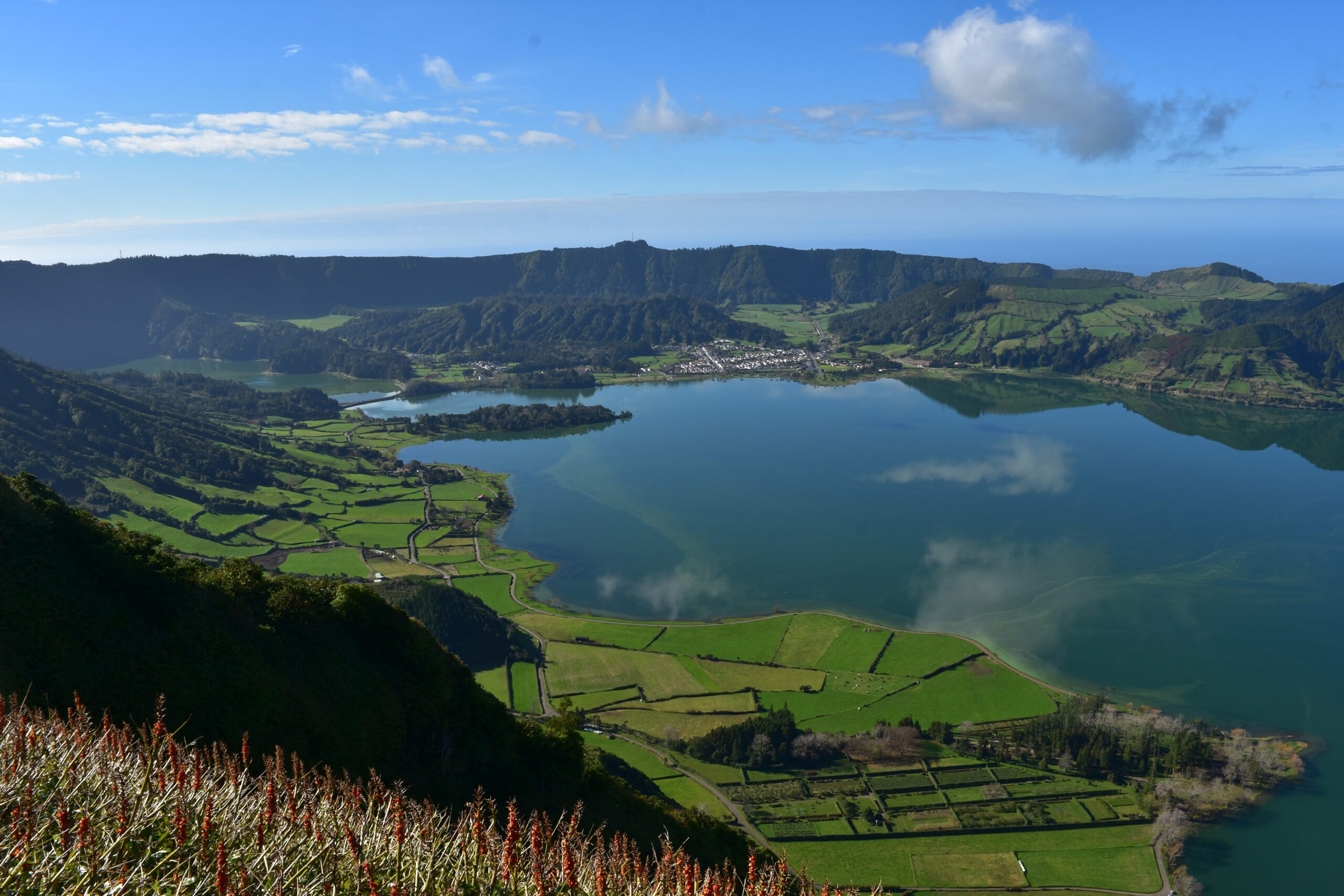 The surrounding area is uniquely serene, encircled by lush vegetation-covered slopes, home to endemic species of the Azores. Several viewpoints, such as the Vista do Rei Viewpoint, offer breathtaking panoramic views of the lake and the volcanic caldera.